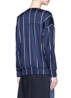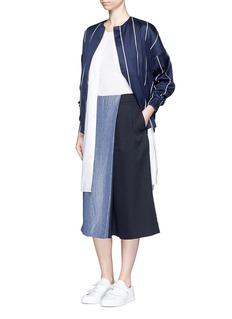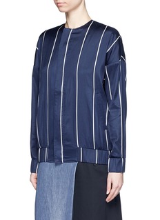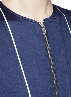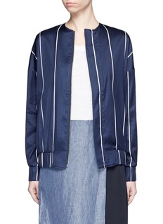 两位艺术家兼设计师Kain Picken和Fiona Lau以中性理念打造品牌FFIXXED STUDIOS。这款夹克白色细条纹搭配深蓝色主调,营造摩登清新之感,落肩袖和松紧袖口及衣摆增添几分随性与帅气。棉混丝面料轻薄顺滑,适宜您春夏季节随身携带和穿着,轻松应对室内外温差。
