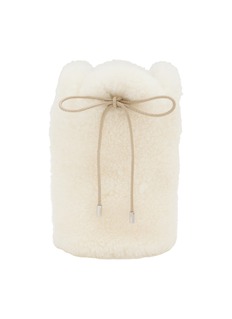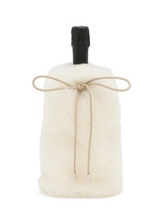 This luxurious shearling champagne cooler is designed to keep your bottle chilled in elegant style. The plush white shearling exterior, tied with a bow, adds a touch of sophistication and warmth to any celebration.