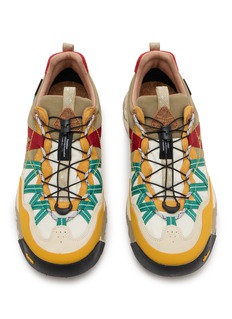 Experience the ultimate in outdoor adventure with Flower Mountain's vibrant, multicoloured hiking sneakers. These durable and waterproof sneakers are designed to withstand the elements, featuring a robust Vibram outsole for unmatched grip and stability on varied terrains. The eclectic mix of colours and textures—from mustard yellow to deep red and soothing teal—reflects a spirited sense of style, while the high-quality waterproof materials ensure your feet stay dry and comfortable.