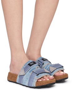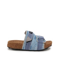 Enhance your summer style with Flower Mountain's denim-inspired sandals. These unique sandals feature a charming blue denim fabric upper, bringing a casual yet fashionable touch to your ensemble. The adjustable strap ensures a perfect fit, while the cork footbed offers supreme comfort for continuous wear. Accented with a distinctive embellished patch, these sandals seamlessly blend functionality with a trendy aesthetic.