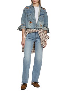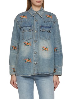 A vintage spirit runs through this denim shirt from FOUND, adorned with delicate bouquet embroidery across its lightly faded wash. Antique silver buttons and yellow contrast stitching elevate its Western sensibility, creating a piece that bridges nostalgia with modern craftsmanship.