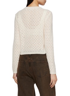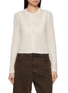 Spun with a plush chenille knit, this cardigan is defined by its airy openwork and delicate pearlescent buttons. Cropped and softly fitted, it adds a tactile romance to everyday styling—layer it over camisoles or dresses to channel effortless femininity with a modern twist.
