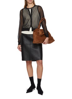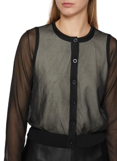 FRAME redefines the cardigan with a daringly sheer knit that reveals what lies beneath. Lightweight and fluid with a silky hand, it transforms a layering essential into a statement of sensual ease. Pair it over camisoles or bralettes for an after-dark allure.