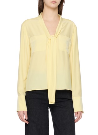 FRAME 融汇了洛杉矶的牛仔服饰传统和伦敦的前卫风尚。这款衬衫采用真丝制成,呈现半透光质感,饰有柔软领结细节、双前袋及精致衬衫式袖口。