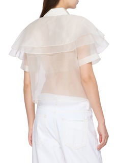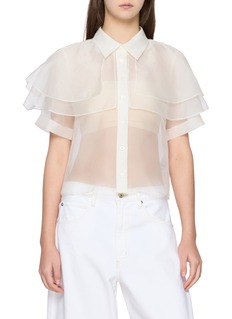 FRAME 融汇了洛杉矶的牛仔服饰传统和伦敦的前卫风尚。这款斗篷上衣采用真丝欧根纱制成,以轻盈飘逸的短款剪裁为基底,叠加斗篷式设计,勾勒出轻盈优雅的廓形。