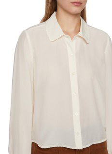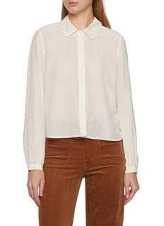 Exuding quiet refinement, this FRAME blouse is cut from lustrous silk and finished with a Peter Pan collar traced in delicate embroidery. Soft gathers at the shoulders lend gentle volume, creating a silhouette that’s both polished and feminine—perfect for workdays or evening pairings.