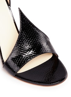Francesco Russo的设计大胆而且富创意,令女士们爱不释手。这款高跟凉鞋以呈三角形的黑色蛇皮搭带拼合鞋后的黑色绒面真皮,为单色设计带来丰富变化,打造通勤或休闲造型同样合适。