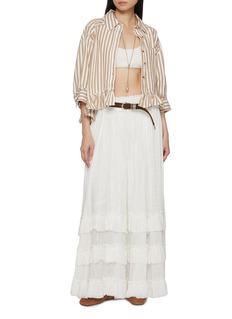 A playful twist on the classic button-down, this striped cotton shirt is cut in a relaxed silhouette with three-quarter length sleeves and a feminine ruffle hem. Its cropped shape pairs effortlessly with high-rise denim or skirts, lending an easy charm to everyday styling.