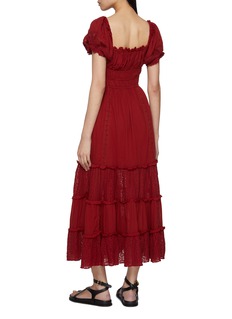 Infused with romance, this midi dress features a ruched bodice, puff sleeves, and tiered lace-trim panels that sway with movement. A sweetheart neckline adds softness, while the rich hue makes it perfect for summer soirées or layered with knits on cooler days.