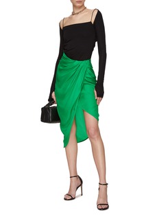 GAUGE81 运用鲜亮大胆的色彩与精准无误的剪裁,打造出精致利落的优雅衣装。这款半裙裁自柔滑真丝,细腻缩褶强调出腰头的围裹效果,裙摆垂坠曳地,摩登绿色调更添吸睛元素,为你的都市装束注入迷人魅力。