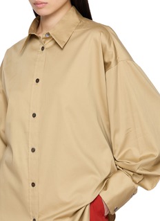 GIA STUDIOS 创立于 2018 年,“Gia” 在越南文中意为 “the house”,是当地工匠展现当代艺术的基地。采用轻盈弹力棉质面料的"Doona"衬衫,随身姿舒展自如,宽阔肩线与立体袖口勾勒出柔美廓形。