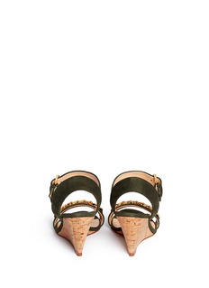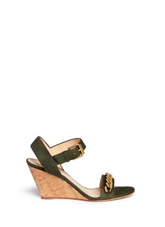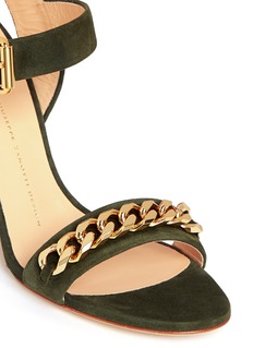 朱塞佩萨诺第的鞋履世界里流露着自由大胆的都市风格,本季将粗锁链装饰运用于凉鞋之中,更具时尚辨识度。充满硬朗格调的军绿色麂皮,和金光闪闪的锁链、质朴自然的木质坡跟作混搭,瞬间变身极具潮流感的个性鞋履,令您的整体造型由上而下闪耀魅力光辉。