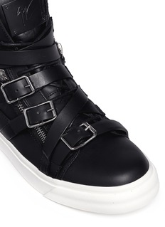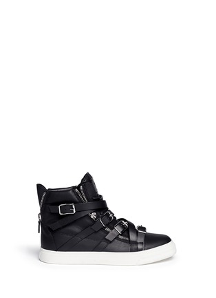 朱塞佩萨诺第继续将其华丽大胆的风格发扬光大,这款高筒运动鞋的低调黑色与朋克银色完美结合,多重交叉搭带叠出层次感,加入拉链点缀,散发暗黑摇滚气息,让您在不同季节都显得前卫过人。