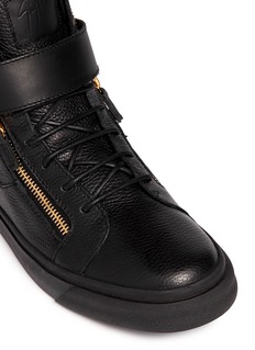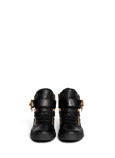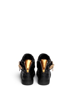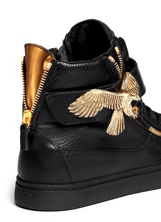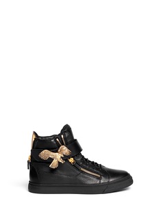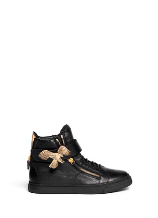 朱塞佩萨诺第在签名式球鞋款中加入了翱翔的雄鹰造型装饰,倍添原始野性味道。保留了以往金属、拉链及魔术贴等细节,金属色皮革拼贴设计则为整体造型注入摇滚感觉,个性夺目、独一无二,必将使您成为街头焦点,彰显潮流先锋的身份。