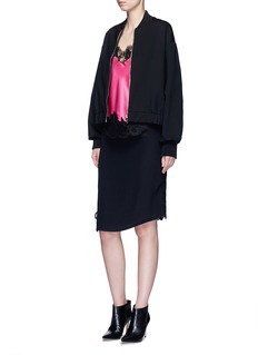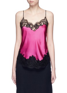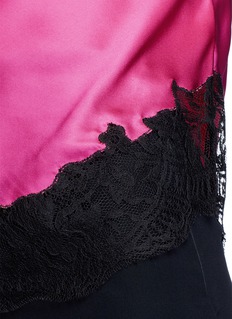 纪梵希此款背心的设计灵感源自流行的睡衣风潮,选用亮眼十足的荧光粉色真丝缎面面料制作,触感细滑亲肤,胸口上方及下摆均拼接黑色蕾丝,全然展现您性感妩媚一面。