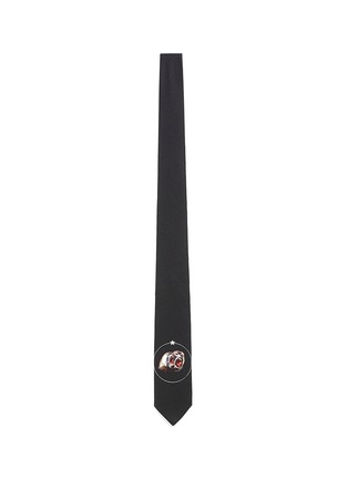 这款纪梵希的领带为西服造型增添酷感元素,标志性的黑色主调中加入星星及圆圈图案,圈内的图案描绘出两只猴子咆哮的情境,极具气势,同时散发品牌独有的暗黑格调。