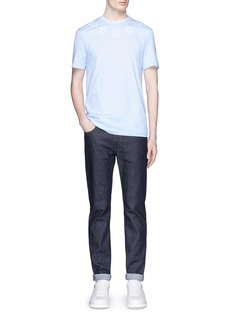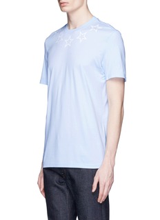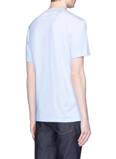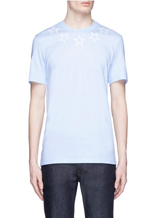 五角星图案是纪梵希标志性的设计。这款纯棉T恤用白色线条勾勒出经典的五角星图案,整齐地排列在圆领周围,配以浅蓝色主调,为夏日造型注入清爽活力。