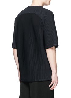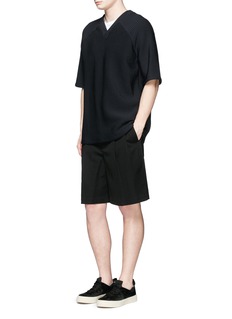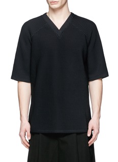 纪梵希以混尼龙针织面料打造出这款富有弹力的上衣,细竖纹在深蓝色之中隐约可见,加上利落舒适剪裁及V领设计,简约而不失时尚趣味,可选择单穿或加搭白色T恤作层次叠穿,塑造休闲随性的街头形象。