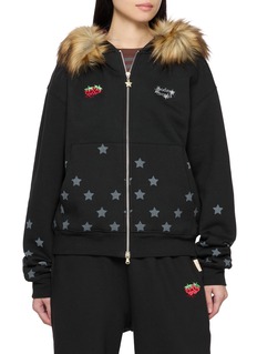 A playful clash of sweetness and edge, this hooded jacket balances cosy structure with youthful charm. Star motifs scatter across the silhouette, while the faux fur–trimmed hood adds winter drama—perfect for layering over casual separates or styled as a statement outer layer.