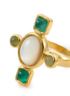 Goossens 以拜占庭和文艺复兴时期的作品为灵感,打造出一系列精美的珠宝首饰及室内装饰品。这款戒指以金色勾勒线条,三色宝石点缀其间,为你的指尖钩织耀眼的波西米亚格调。