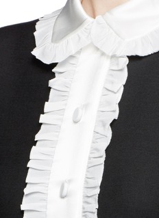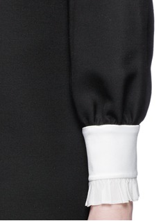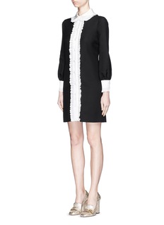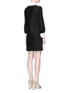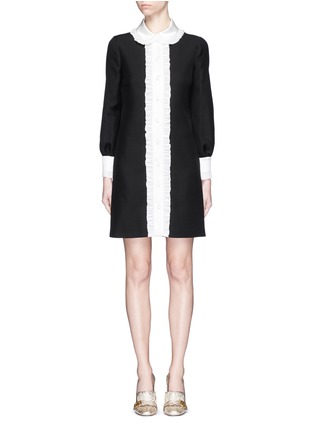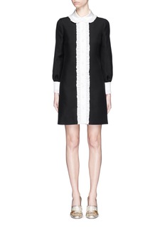 这款古驰的连衣裙充分展现女性柔美古典的气质,以黑色真丝混羊毛面料为基础,领部、开襟及袖口均采用白色缎面面料打造,构成鲜明的拼色设计,彼德潘圆领复古感十足,加入荷叶边装饰,倍显浪漫甜美。