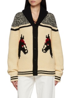 Guest in Residence 以设计未来传家之宝为使命,推出经久耐穿的经典针织品。品牌灵感源于 Gigi 在纽约生活时从父母那里继承的、承载着回忆的二手羊绒毛衣。这款开衫以马术为灵感,手工刺绣马匹、双层披肩领和大理石纹肩轭细节钩织个性,可敞开穿着,也可使用前襟纽扣将自己温暖包裹。