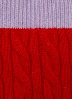 Step into comfort and style with the Guest in Residence cable knit socks. These vibrant red socks are crafted from a cozy wool blend, ensuring both warmth and durability. The classic cable knit pattern adds a touch of timeless elegance, while the contrasting lavender toe and heel caps introduce a playful color pop.