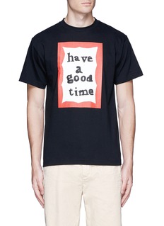 此款T恤来自have a good time新季系列,这个来自日本东京的品牌将低调玩味发挥得淋漓尽致,黑色主调搭配大型的红、黑、白色品牌标志,配以趣味字体,简约而抢眼,搭配亮色短裤,打造活力年轻形象最为合适。