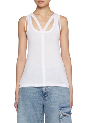 Helmut Lang 充满活力的实用主义捕捉到了当今的纽约精神。品牌创立于 1986 年,逐渐成为不羁思想和极简实用主义设计的代表。这款背心多缎带设计颇具性感韵味。