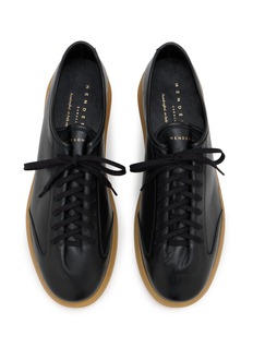 Elevate your style with Henderson's exclusive black leather sneakers. Crafted with precision from the finest leather, these sneakers offer a luxurious and smooth feel, complemented by their sleek black laces and a distinctive translucent amber sole. The classic low-top design ensures timeless appeal, making these shoes a versatile choice for any wardrobe.