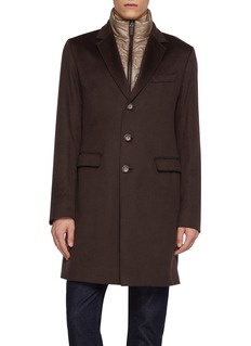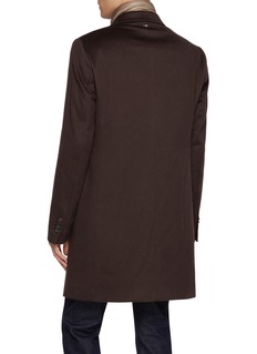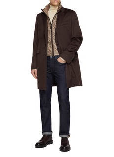 Tailored with the precision of Italian craftsmanship, this Herno coat is cut from pure cashmere with a subtle sable-effect sheen. The detachable quilted bib offers added warmth and a layered sophistication, making it a refined essential for transitional and winter styling.