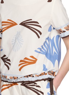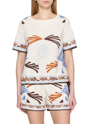 轻盈面料的透气肌理与度假风印花形成微妙共鸣,Herno 的松紧腰头消解了 T 恤的无趣感,抽象印花则在低调中注入视觉张力,让这件单品既能适配海滨度假的松弛时刻,也能从容应对都市日常的多元场景。