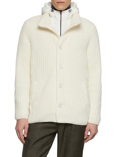 意大利品牌 Herno 以功能性雨衣、羽绒服和外套为主打产品,以扎实用料及高端性能著称。这款开衫采用可拆卸连帽设计,适应多样穿着需求,拉链和纽扣开襟设计勾勒精致层次,抽绳连帽增添运动感,针织面料确保舒适触感。可搭配直筒休闲长裤和运动鞋,演绎现代都市休闲风格。