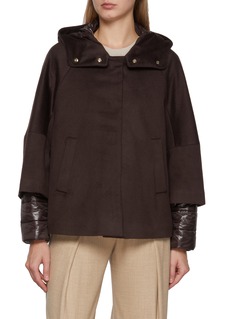 HERNO 以意大利传统制衣工艺著称,注重细节与品质的平衡。这款夹克以双面料拼接设计为亮点,主体与袖子材质形成有趣对比。连帽剪裁提供多样穿着选择,金属纽扣细节展现品牌对工艺的执着追求。