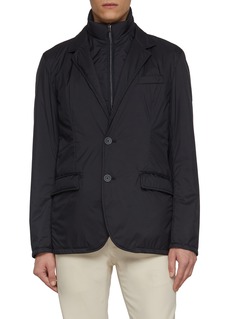 Streamlined and versatile, this Herno blazer merges tailored structure with the ease of a lightweight puffer. Cut from water-repellent poly, it features a detachable quilted bib that shifts effortlessly from sleek office polish to weather-ready functionality. A modern essential for transitional days.