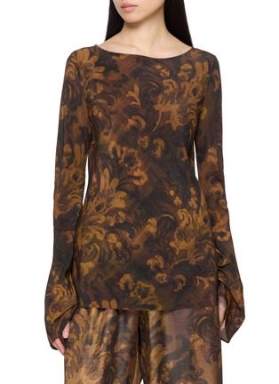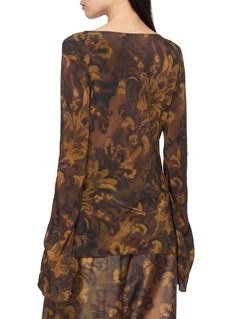 INTO THE EAST 立意于包容万象的东方哲学,亲历世界各地乐撷文化珍宝,解构缝制多元人文、手工艺以及旧物情怀。这款上衣以微透肌理传递浪漫调性,印花细节暗藏艺术巧思,喇叭袖设计彰显复古质感。