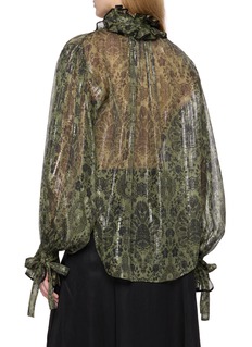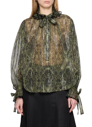 INTO THE EAST 立意于包容万象的东方哲学,亲历世界各地乐撷文化珍宝,解构缝制多元人文、手工艺以及旧物情怀。这件单品选用透感混纺面料,满印棕榈叶提花交织出复古氛围,木耳领与袖口蝴蝶结系带注入柔美元素,宽松廓形弱化正装感。