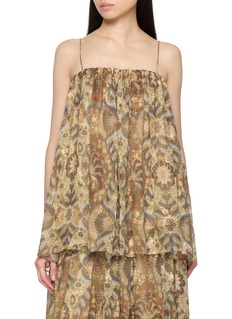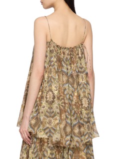 INTO THE EAST 立意于包容万象的东方哲学,亲历世界各地乐撷文化珍宝,解构缝制多元人文、手工艺以及旧物情怀。这款吊带上衣以轻盈肌理传递浪漫调性,印花细节暗藏异域巧思,双层设计彰显层次质感。