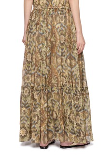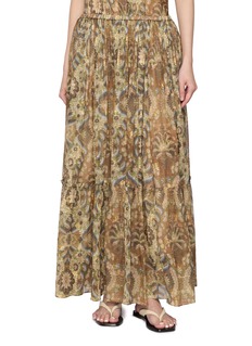 INTO THE EAST 立意于包容万象的东方哲学,亲历世界各地乐撷文化珍宝,解构缝制多元人文、手工艺以及旧物情怀。这款半身裙以轻盈肌理传递浪漫调性,印花细节暗藏异域巧思,微透面料设计彰显层次质感。