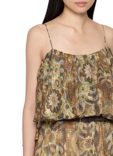INTO THE EAST 立意于包容万象的东方哲学,亲历世界各地乐撷文化珍宝,解构缝制多元人文、手工艺以及旧物情怀。这款连衣裙以轻盈肌理传递浪漫调性,印花细节暗藏异域巧思,层叠设计彰显层次质感。I