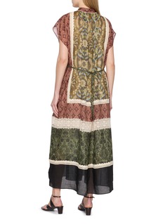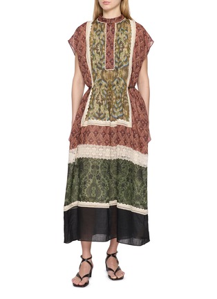 INTO THE EAST 立意于包容万象的东方哲学,亲历世界各地乐撷文化珍宝,解构缝制多元人文、手工艺以及旧物情怀。这件单品选用轻盈透感面料,满印花卉与佩斯利纹样交织出复古氛围,蕾丝拼接与抽绳收腰注入柔美元素,立领门襟弱化休闲感。