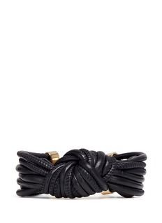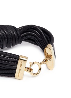 Isabel Marant这款手镯将数根黑色小羊皮绳固定于金色底座,并制造出扭结装饰,带来富有力量和线条感的摩登设计。金色和黑色的经典搭配贵气优雅,为您的造型增添亮眼不俗的细节焦点。