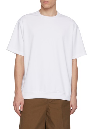 Light yet structured, this crewneck T-shirt is spun from washed washi yarn for a dry, breathable touch with subtle texture. J∞QUALITY refines the oversized silhouette with dropped shoulders and a ribbed hem, lending architectural ease to everyday dressing—ideal with tailored shorts or relaxed trousers.