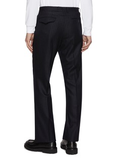 Impeccably tailored in chalk stripe wool with a touch of stretch, these J∞QUALITY trousers fuse tradition with subtle rebellion. Flared legs add modern movement, while flap back pockets and pressed creases sharpen the line—ideal for suited looks with an edge.