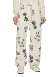Infused with artistry, these drawstring pants feature sumi-inspired sketches of flora and fauna, evoking the spirit of hand-inked illustration. Crafted in cotton with a touch of stretch and double-needle detailing, the relaxed cut ensures comfort while exuding quiet elegance—ideal for pairing with minimalist knitwear or crisp shirting.