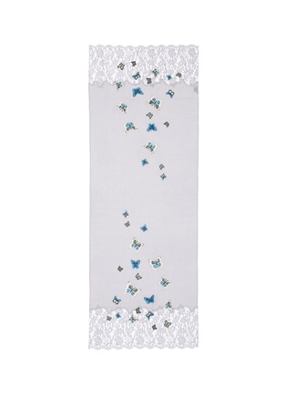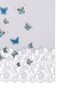 Janavi是印度首屈一指的羊绒品牌,优质面料结合精湛工艺打造出的单品令人赞叹不已。这款羊绒围巾手感细腻轻巧,形态不一的蝴蝶刺绣栩栩如生,两端的蕾丝拼接更添甜美女人味,让您感受温柔呵护。