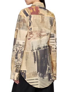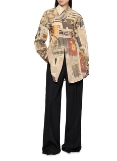 Historic imagery and printed headlines unfold across this long-sleeved shirt, echoing Jean Paul Gaultier’s fascination with media and memory. Tailored yet fluid, it lends quiet provocation to everyday dressing—style it buttoned up with tailored trousers or worn loose for gallery-bound afternoons.