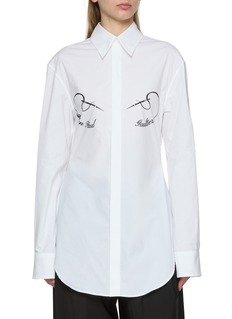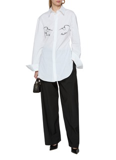 A crisp poplin shirt by Jean Paul Gaultier, animated with mirrored needle-and-thread motifs that trace across the chest like hand-drawn emblems. Its elongated hem and sharp collar lend a tailored purity, while the graphic detailing adds a subtle subversive wink—ideal under suiting or worn loose for contrast.
