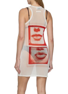 A vivid revival from Jean Paul Gaultier’s archives, this mesh dress frames the body with bold red “eyes and lips” panels that appear like surrealist portraits in motion. Its sheer, sculpting fit heightens the visual impact—perfect layered over lingerie or styled with sharp tailoring for an avant-garde contrast.
