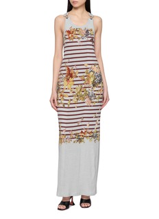 A signature Jean Paul Gaultier marinière is reimagined through a surreal grape motif, merging nautical stripes with trompe-l’œil florals. Cut in ribbed cotton, the elongated silhouette skims the body with ease—ideal for gallery afternoons or layered evenings with sculptural heels.